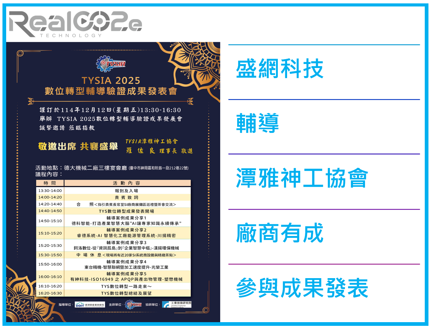 2025年 12/12日 下午13:30 盛網科技將參與潭雅神工協會 數位轉型輔導與驗證成果發表會