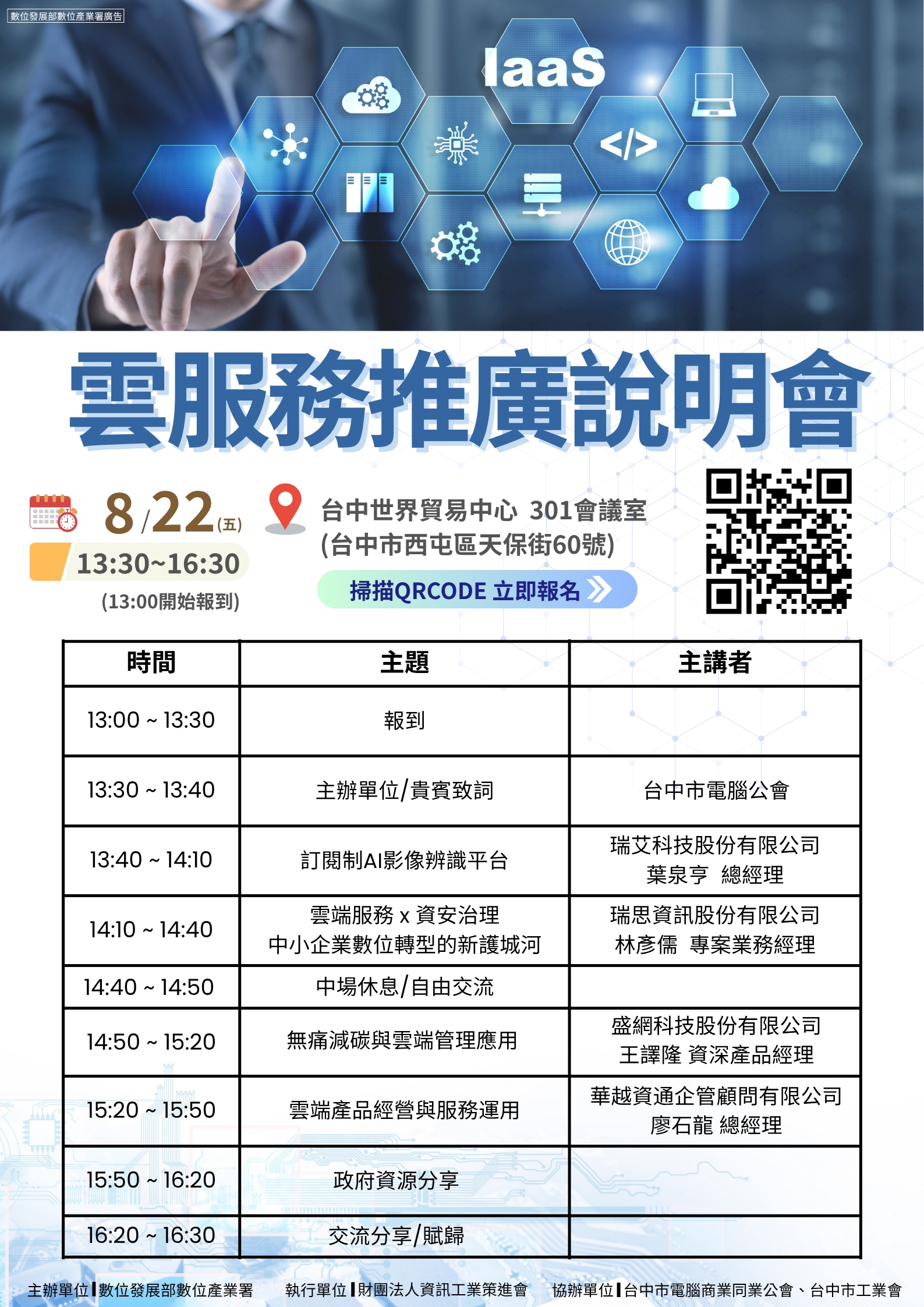 由 台中市電腦公會 舉辦的「雲服務推廣說明會」將於 2025年8月22日 舉行,本次活動特別邀請 盛網科技資深產品經理 王譯隆 經理 擔任講者,主題為 《無痛減碳與雲端管理應用》。