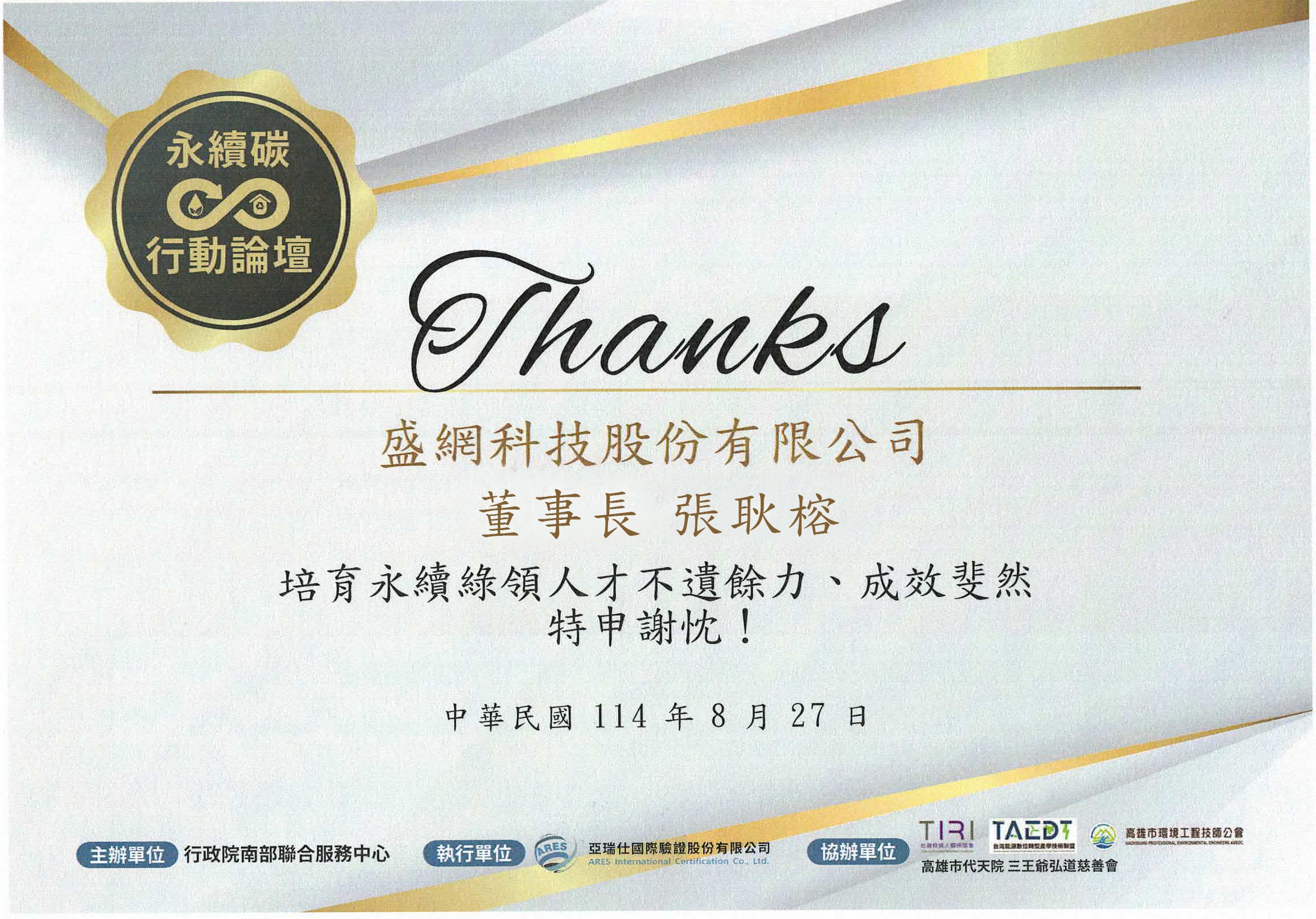 2025年8月27日(星期三),由 亞瑞仕國際驗證股份有限公司 主辦的《2025永續碳行動論壇》順利舉行,盛網科技受邀雙重參與,展現企業對碳管理與永續發展的承諾。