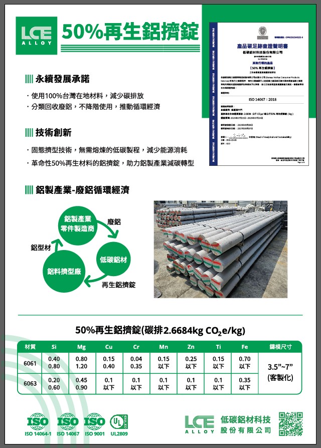 低碳鋁材科技股份有限公司近期推出的 50%再生鋁擠錠產品,成功通過產品碳足跡認證,成為鋁產業循環經濟的重要里程碑。