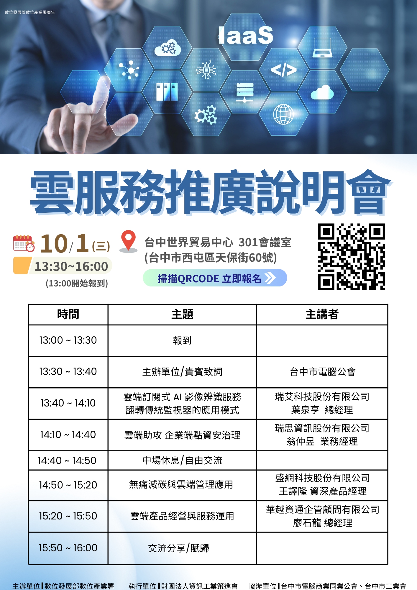 盛網科技資深產品經理 王譯隆 經理 受 台中市電腦公會 邀請,將於 114年10月1日(三) 在「雲服務推廣說明會」中發表專題演講 《無痛減碳與雲端管理應用》。